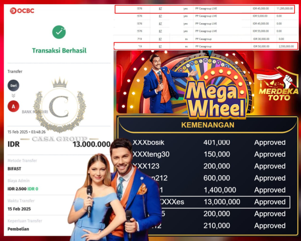 Selamat Kepada Member MERDEKATOTO dengan Username XXXXXXXXXes yang Telah Memperoleh Jackpot Sebesar Rp. 13.000.000 di MEGA WHEEL.