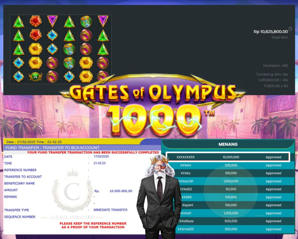Selamat Kepada Member CASAGROUP dengan Username XXXXXXX55 Yang Beruntung Mendapatkan Kemenangan Besar di DOLARTOTO Dalam Permainan GATES OF OLYMPUS – Pragmatic Play.