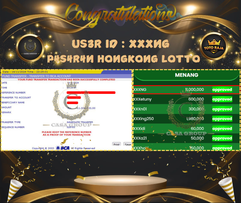 SELAMAT KEPADA MEMBER TOTORAJA DENGAN USER ID : XXXNG YANG BERHASIL MENDAPATKAN JACKPOT SEBESAR Rp.11.000.000,- PADA PASARAN HONGKONG LOTTO YANG LANGSUNG DIBAYAR LUNAS TANPA POTONGAN , BAGI YANG BELUM MENDAPATKAN JACKPOT BURUAN GABUNG DISITUS TOTORAJA YANG AMAN DAN TERPERCAYA DENGAN MEMBAYAR SEMUA KEMENANGAN ANDA