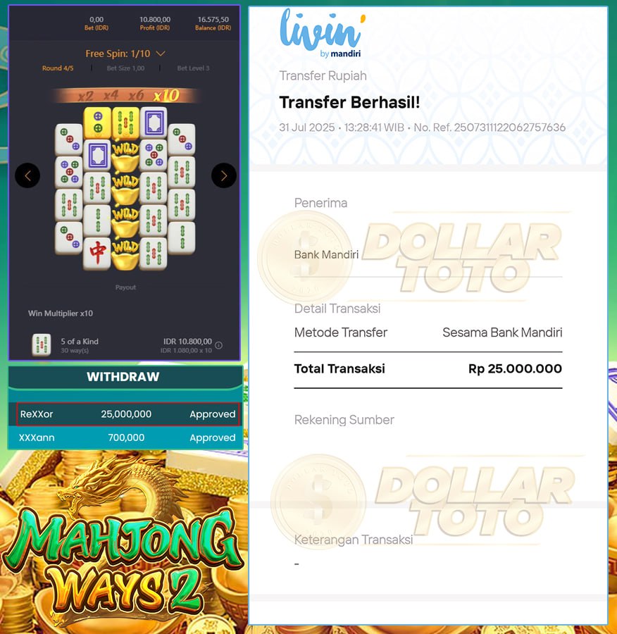 Selamat kepada member yang bermain di DOLLARTOTO dengan user id ReXXor yang telah mendapatkan kemenangan SENSATIONAL di game MAHYONG WAYS 2 > PGSOFT . Untuk kemenangan sebesar Rp. 25.000.000 sudah berhasil kami proseskan secara lunas dan tuntas tanpa adanya macet macet !! Segera daftarkan dirimu sekarang dan jadi pemenang selanjutnya di DOLLARTOTO
