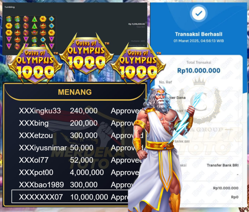 Selamat Kepada Member MERDEKATOTO dengan User ID XXXXXXX07 Atas Kemenangan di Game GATES OF OLYMPUS 1000 – PRAGMATIC PLAY.
