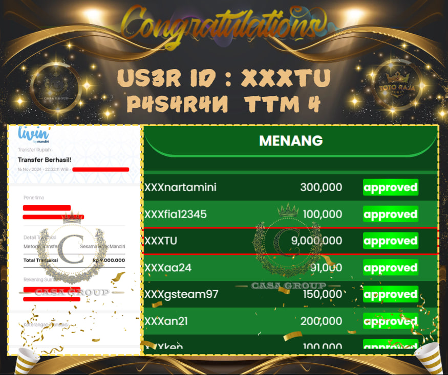 SELAMAT ATAS JACKPOT YANG DIRAIH MEMBER TOTORAJA DENGAN USER ID : XXXTU YANG BERHASIL MENDAPATKAN KEMENANGAN BESAR DALAM PERMAINAN TOGEL DIPASARAN TOTOMACAU SEBESAR Rp. 9.000.000,- YANG SUDAH DIBAYAR LUNAS TANPA POTONGAN,, BURUAN DAFTARKAN AKUN ANDA DISITUS TOTORAJA DAN RAIH KEMENANGAN YANG BESAR.