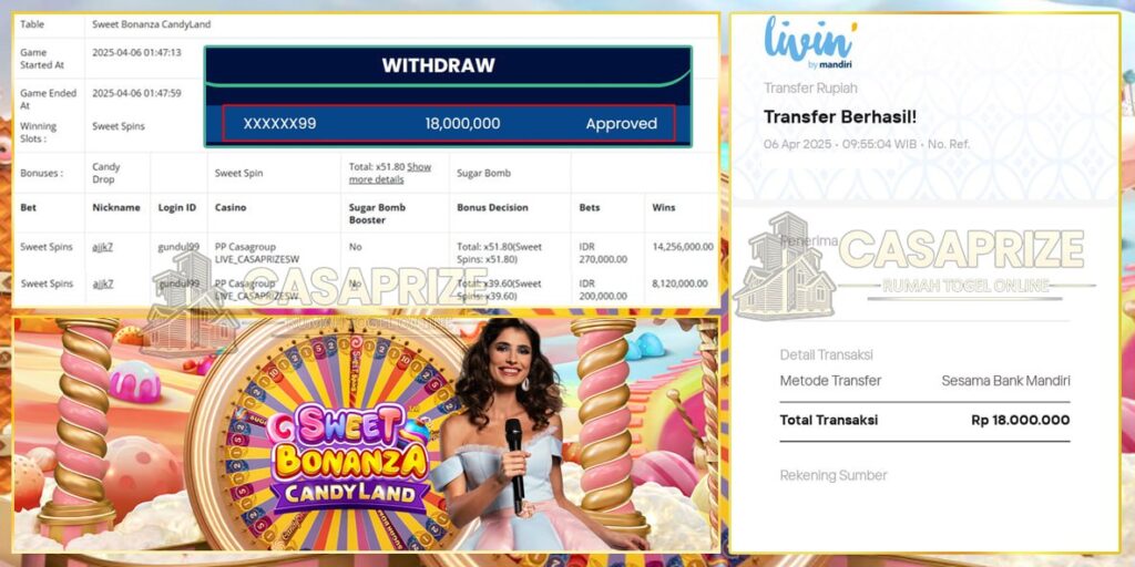 Selamat Kepada Member CASAGROUP dengan Username XXXXX99 Yang Beruntung Mendapatkan Kemenangan Besar di CASAPRIZE Dalam Permainan PRAGMATIC CASINO >> SWEET BONANZA CANDY LAND
