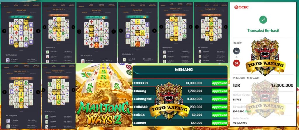 Selamat kepada bosku yang bermain di TOTOWAYANG dengan user id XXXXXXX99 telah mendapatkan kemenangan besar di game PG SOFT MAHJONG WAYS 2