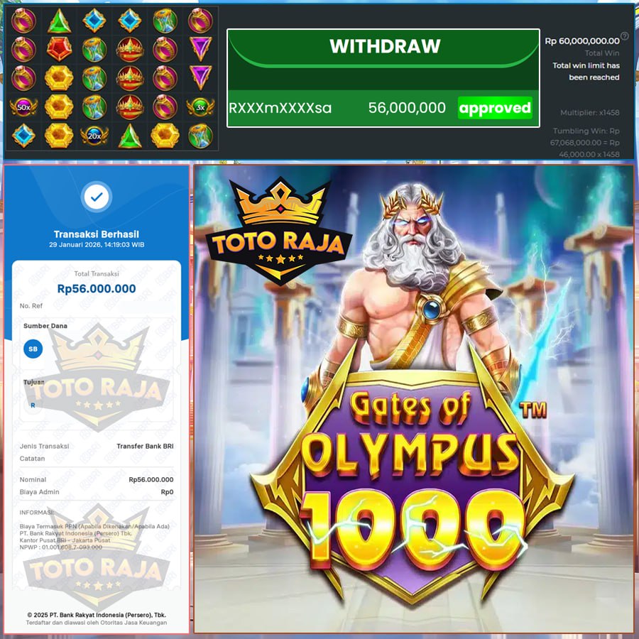 Selamat Kepada Member TOTORAJA dengan Username  RXXXmXXXXsa Yang Beruntung Mendapatkan Kemenangan Besar di Dalam Permainan  GATES OF OLYMPUS 1000 >>  PRAGMATIC PLAY .