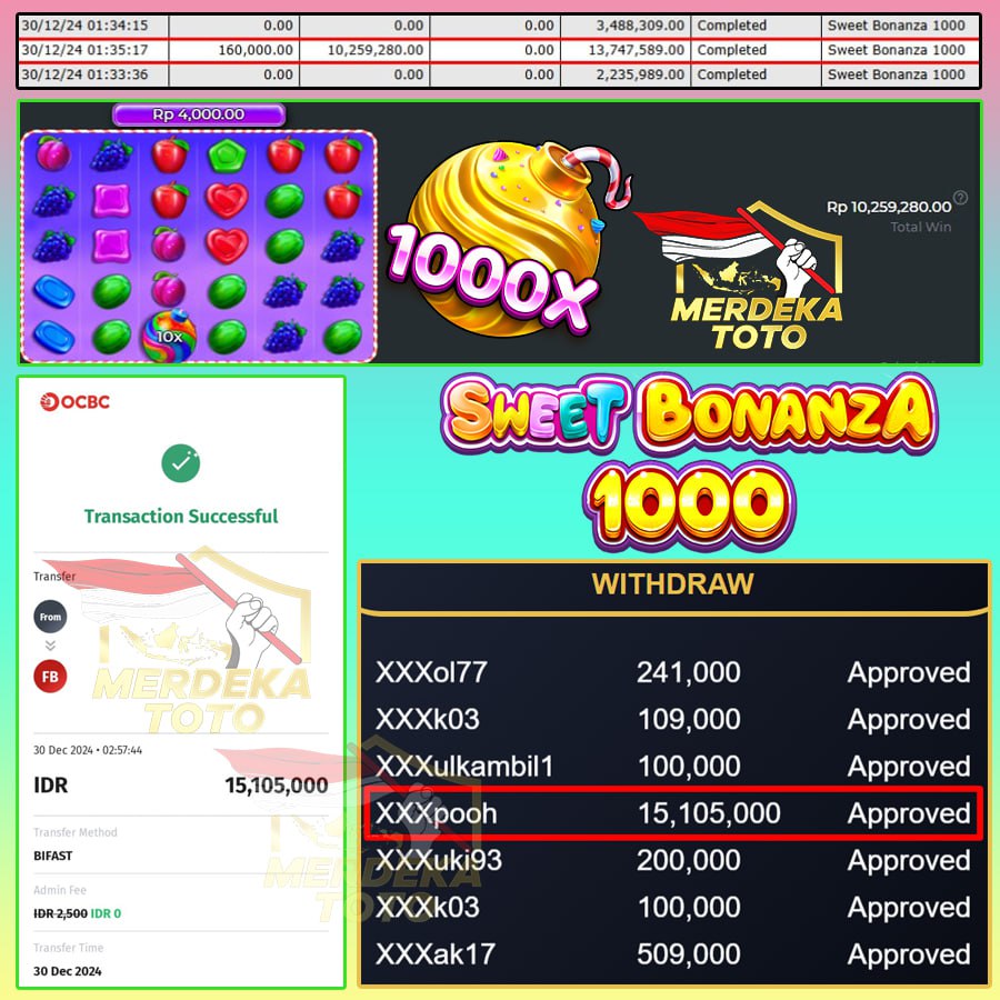 Selamat kepada member MERDEKATOTO user id XXXXooh yang telah mendapatkan kemenangan besar di game PRAGMATIC >> SWEET BONANZA 1000.