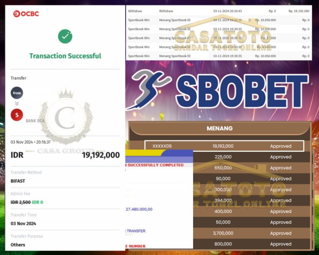 Selamat kepada bosku user id XXXXO9 yang telah mendapatkan kemenangan besar di SBOBET dengan kemenangan yang luar biasa.