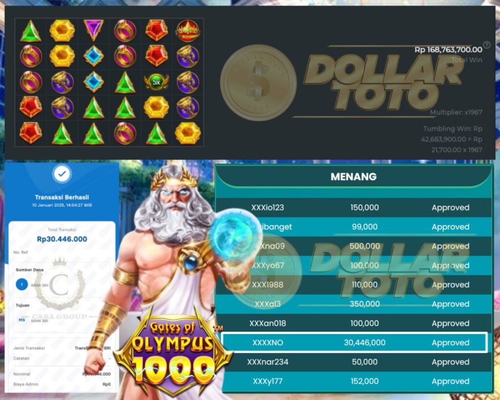 SELAMAT KEPADA MEMBER DOLLARTOTO DENGAN USER ID XXXXNO MENANG DI GAME GATES OF OLYMPUS 1000 >> PRAGAMTIC PLAY