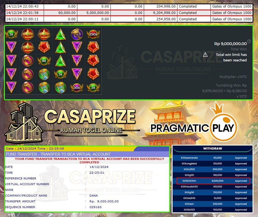 Selamat kepada bosku yang bermain di CASAPRIZE dengan user id XXXXXXXXn yang telah mendapatkan kemenangan besar di game GATES OF OLYMPUS 1000 > PRAGMATIC SLOT