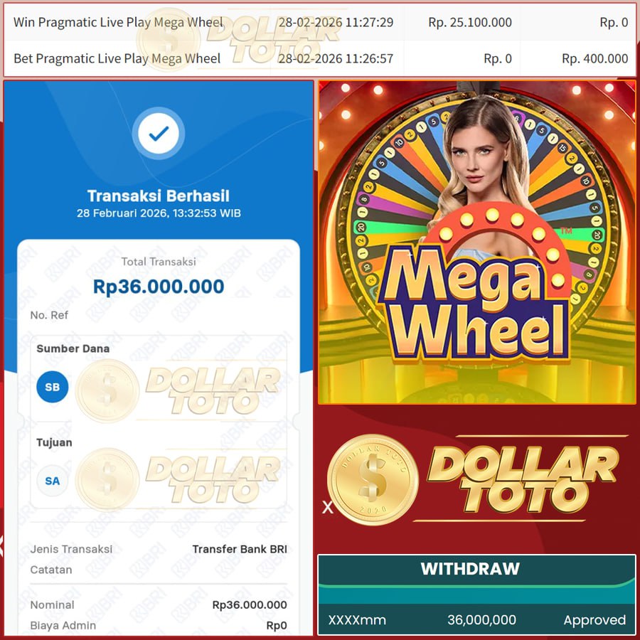 Selamat Kepada Member DOLLARTOTO dengan User ID XXXXXmm yang Kembali Meraih Kemenangan Dari Game MEGA WHEEL – PRAGMATIC LIVE.