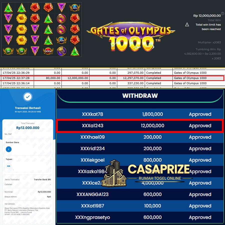 Selamat kepada bosku yang bermain di CASAPRIZE dengan user id XXXa1243 yang telah mendapatkan kemenangan besar di game GATES OF OLYMPUS 1000> PRAGMATIC PLAY SLOT .