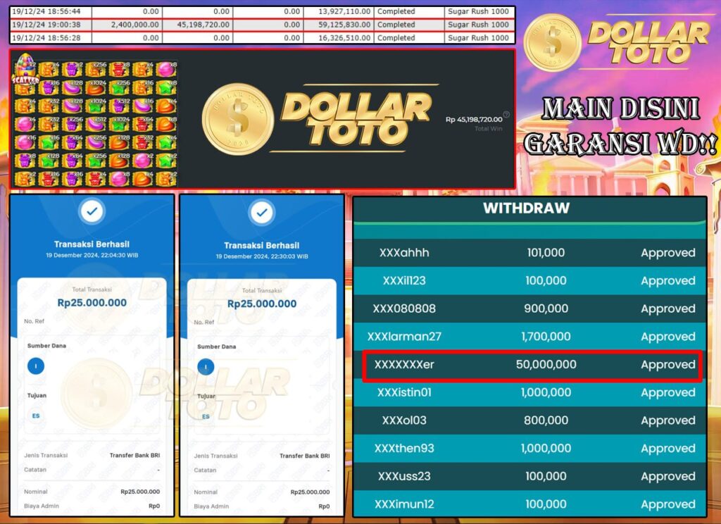 Selamat kepada bosku yang bermain di DOLLARTOTO dengan user id XXXXXter yang telah mendapatkan kemenangan besar di game SUGAR RUSH 1000 > PRAGMATIC PLAY