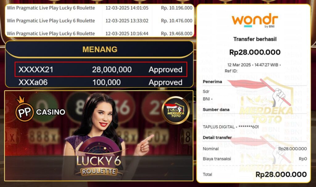Selamat kepada member kami yang telah mendaftar di bo MERDEKATOTO atas user id XXXXXX21 yang telah mendapatkan kemenangan besar di LUCKY 6 ROULETTE