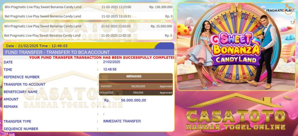 Selamat Kepada Bosku User ID XXX1207 Yang Telah mendapatkan Kembali Kemenangannya Di CASATOTO di Permainan PRAGMATIC LIVE > SWEET BONANZA CHANDYLAND.