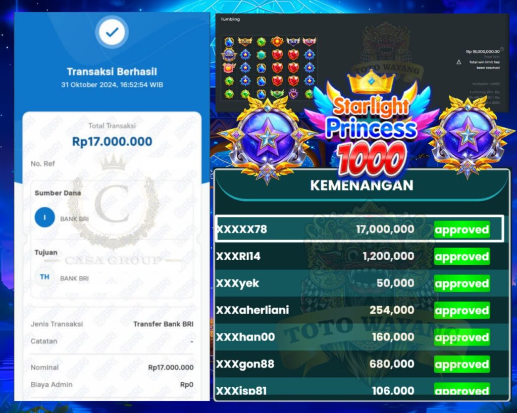 Selamat kepada bosku yang mendaftar di situs TOTOWAYANG user id XXXXX78 yang telah mendapatkan kemenangan besar di STARLIGHT PRINCESS.