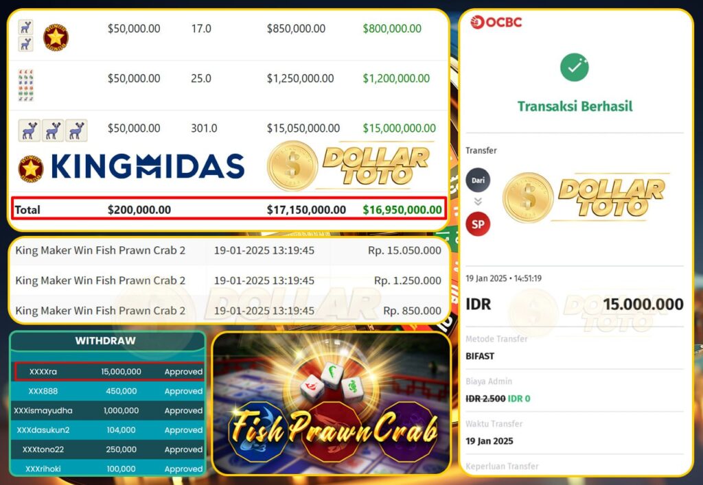 Selamat kepada bosku yang bermain di DOLLARTOTO dengan user id XXXXra yang telah mendapatkan kemenangan BIG WIN DI PROVIDER KINGMIDAS > FISH PRAWN CRAB 2