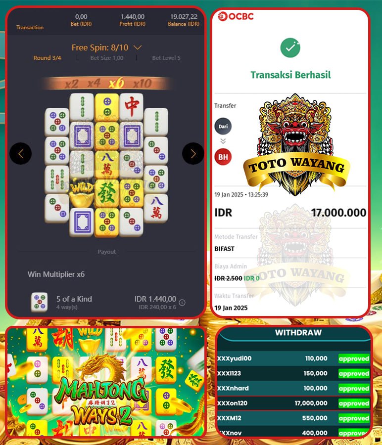 SELAMAT KEPADA MEMBER TOTOWAYANG DENGAN USER ID XXXON120 MENANG DI GAME MAHJONG WAYS 2 >> PG SOFT