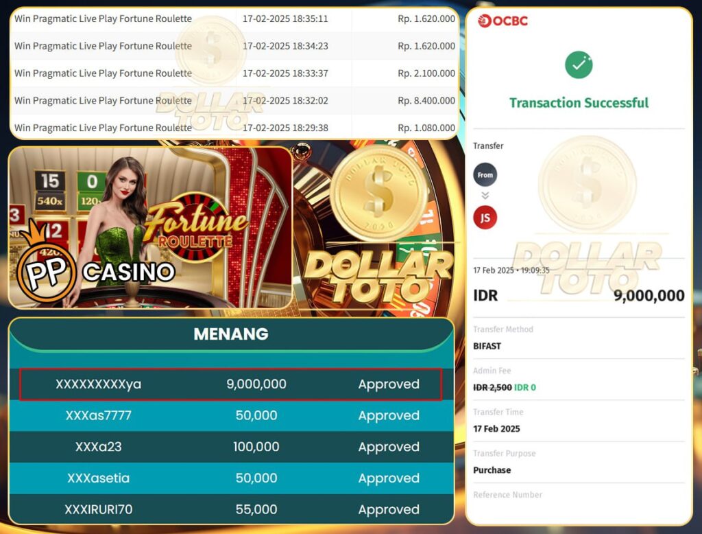 SELAMAT KEPADA MEMBER DOLLARTOTO, USER ID : XXXXXXXXXXXya , MENANG DI GAME PRAGMATIC LIVE CASINO > FORTUNE ROULETTE
