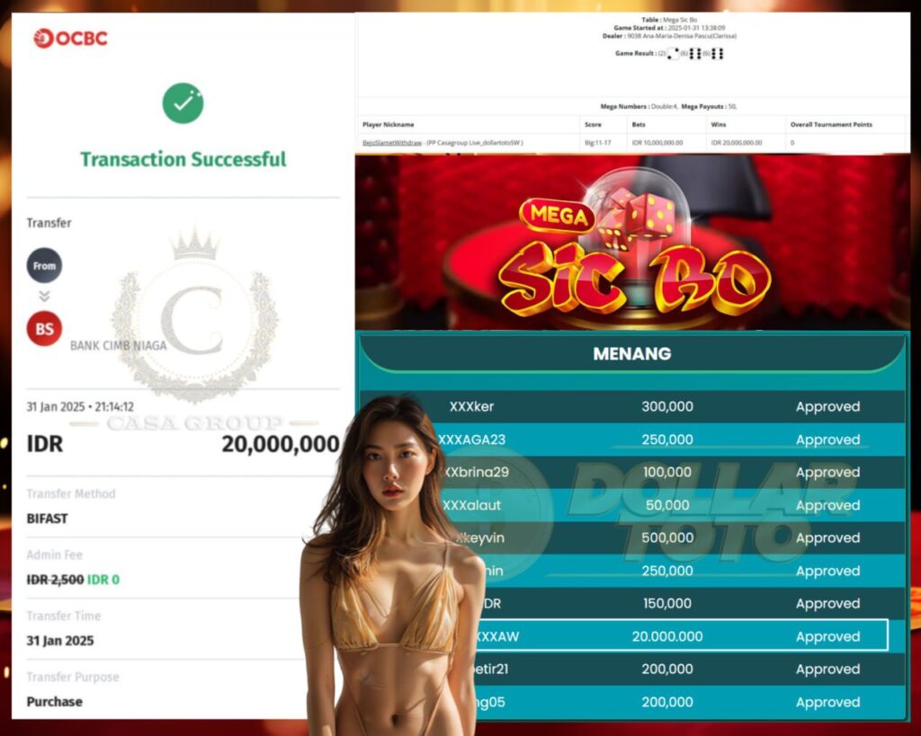 SELAMAT KEPADA MEMBER DOLLARTOTO, USER ID : XXXXXXXXXXXXXAw, MENANG DI GAME PRAGMATIC LIVE CASINO  MEGA SICBO