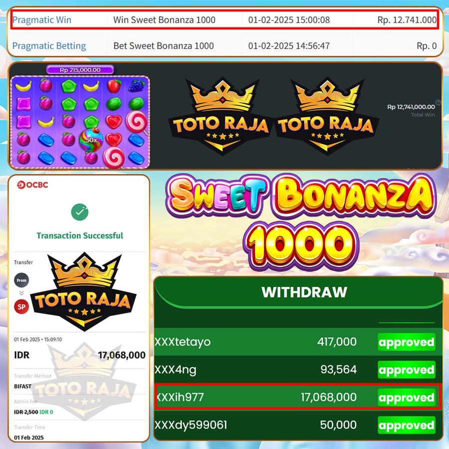 Selamat kepada bosku yang bermain di TOTORAJA dengan user id XXXih977 yang telah mendapatkan kemenangan besar di game SWEET BONANZA 1000 > PRAGMATIC PLAY