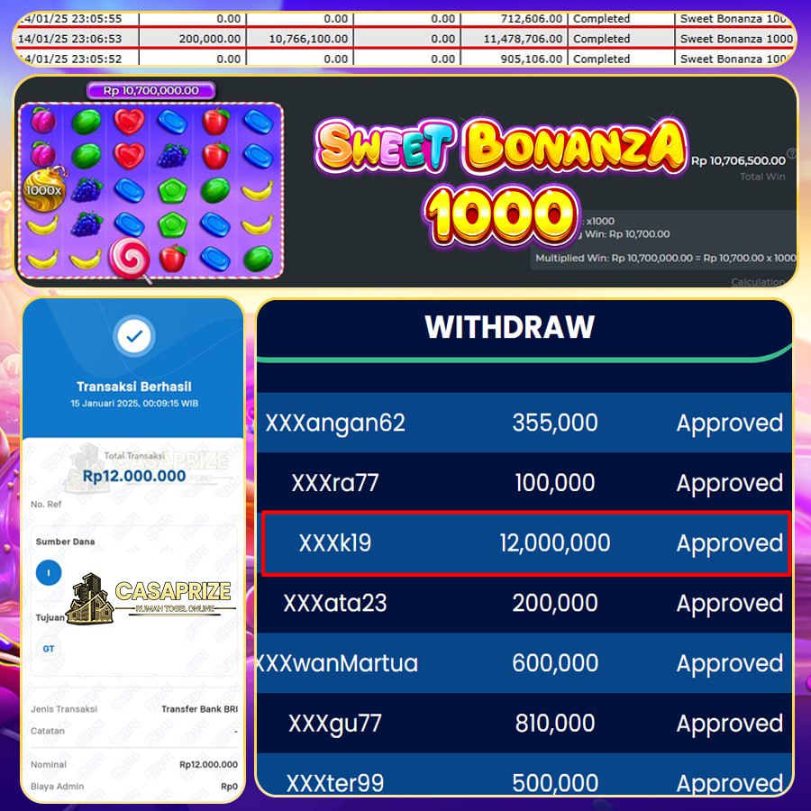 Selamat kepada bosku yang bermain di CASAPRIZE dengan user id XXXk19 yang telah mendapatkan kemenangan besar di game SWEET BONANZA 1000 > PRAGMATIC PLAY
