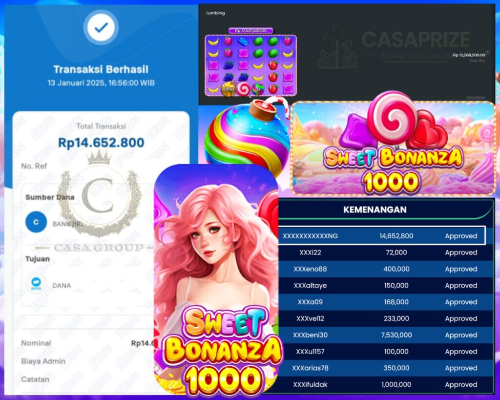 Selamat kepada bosku yang bermain di CASAPRIZE dengan user id XXXXXXXXXXXNG yang telah mendapatkan kemenangan besar di game SWEET BONANZA 1000 > PRAGMATIC PLAY