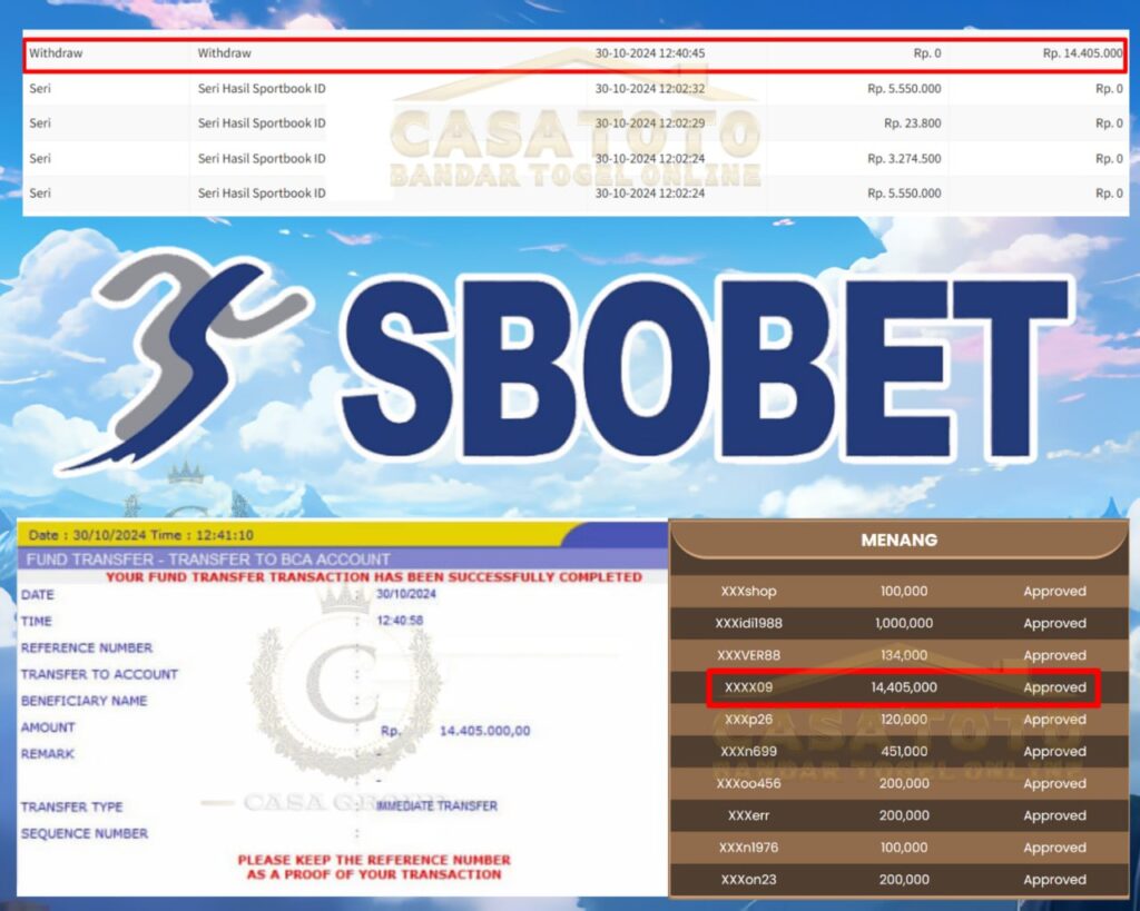 Selamat kepada member kami user id XXXXO9 yang sudah mendapatkan kemenangan besar di SBOBET.