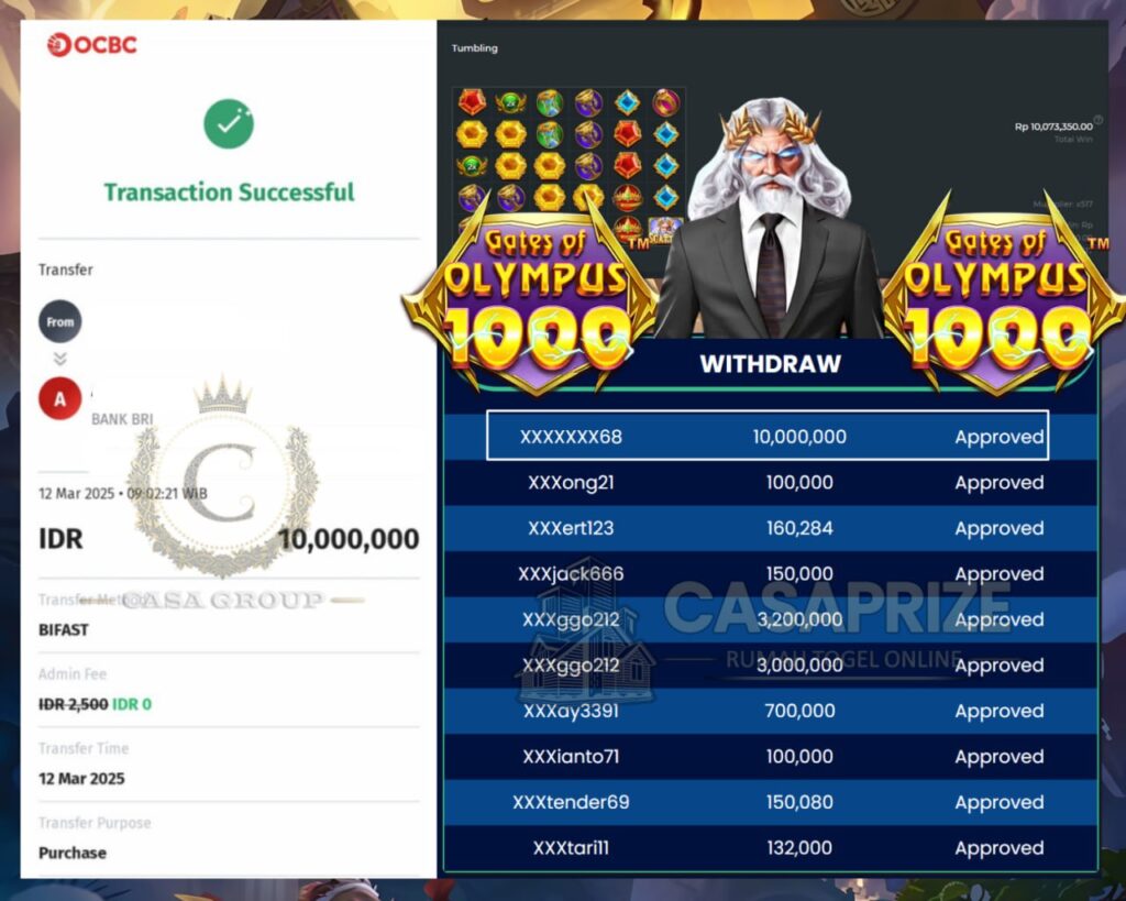 Selamat Kepada Member CASAPRIZE dengan User ID XXXXXX68 Atas Kemenangan di Game GATES OF OLYMPUS 1000 – PRAGMATIC PLAY.