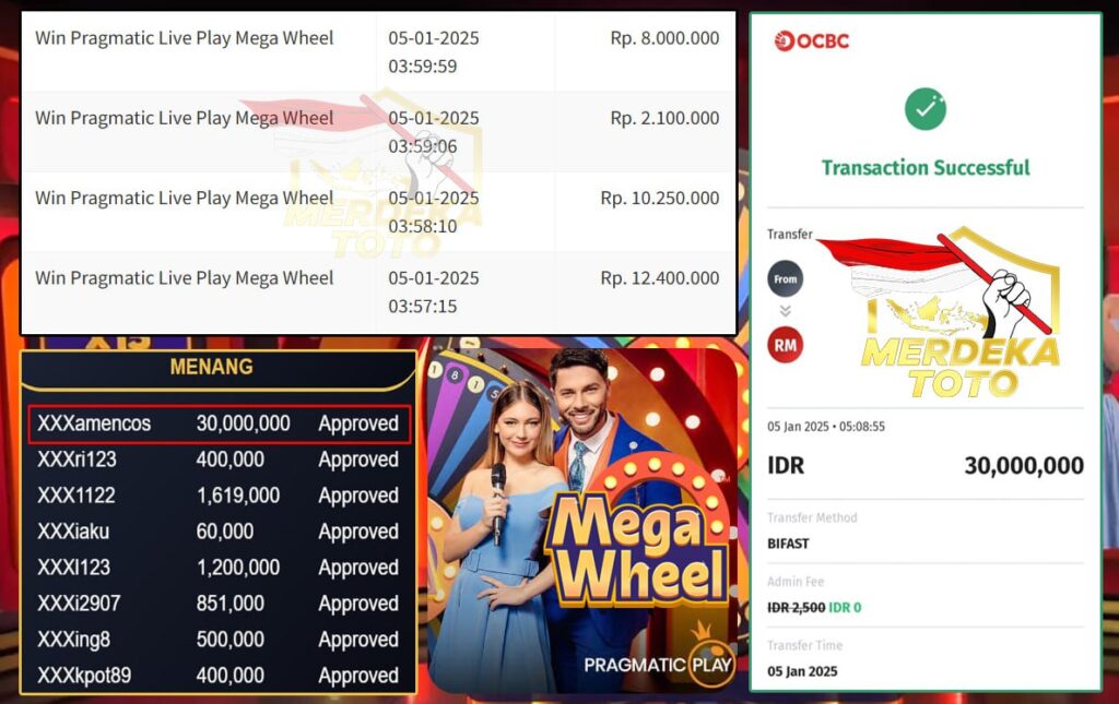 Selamat kepada bosku yang bermain di MERDEKATOTO dengan user id XXXXXXXcos yang telah mendapatkan kemenangan besar di game MEGA WHEEL > PRAGMATIC LIVE