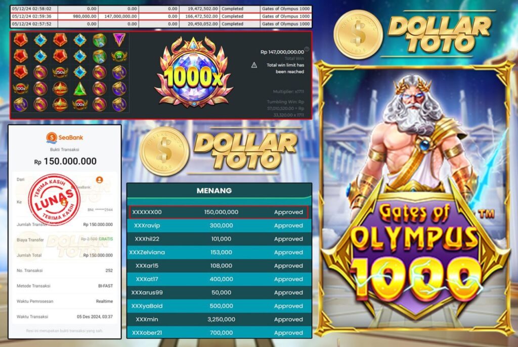 Selamat kepada bosku yang bermain di DOLLARTOTO dengan user id XXXXXX00 yang telah mendapatkan kemenangan besar di game GATES OF OLYMPUS 1000 > PRAGMATIC SLOT