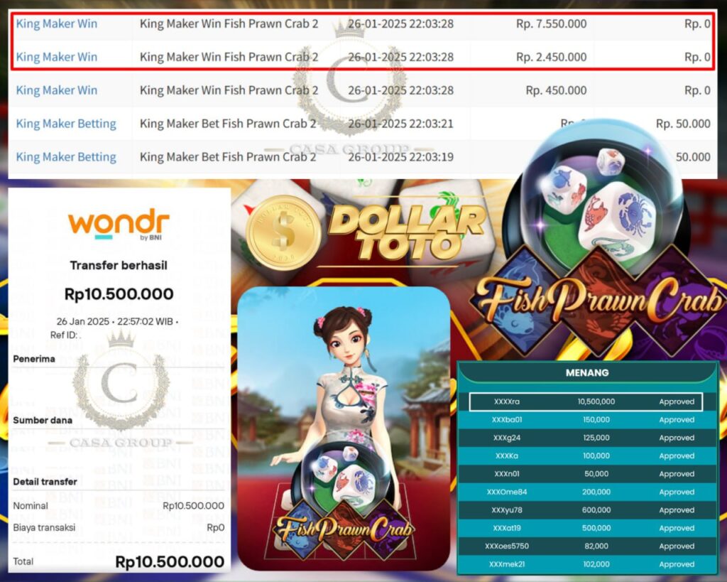 SELAMAT KEPADA MEMBER DOLLARTOTO, USER ID : XXXXra TELAH JACKPOT DI GAME KING MAKER > FISH PRAWN CRAB 2