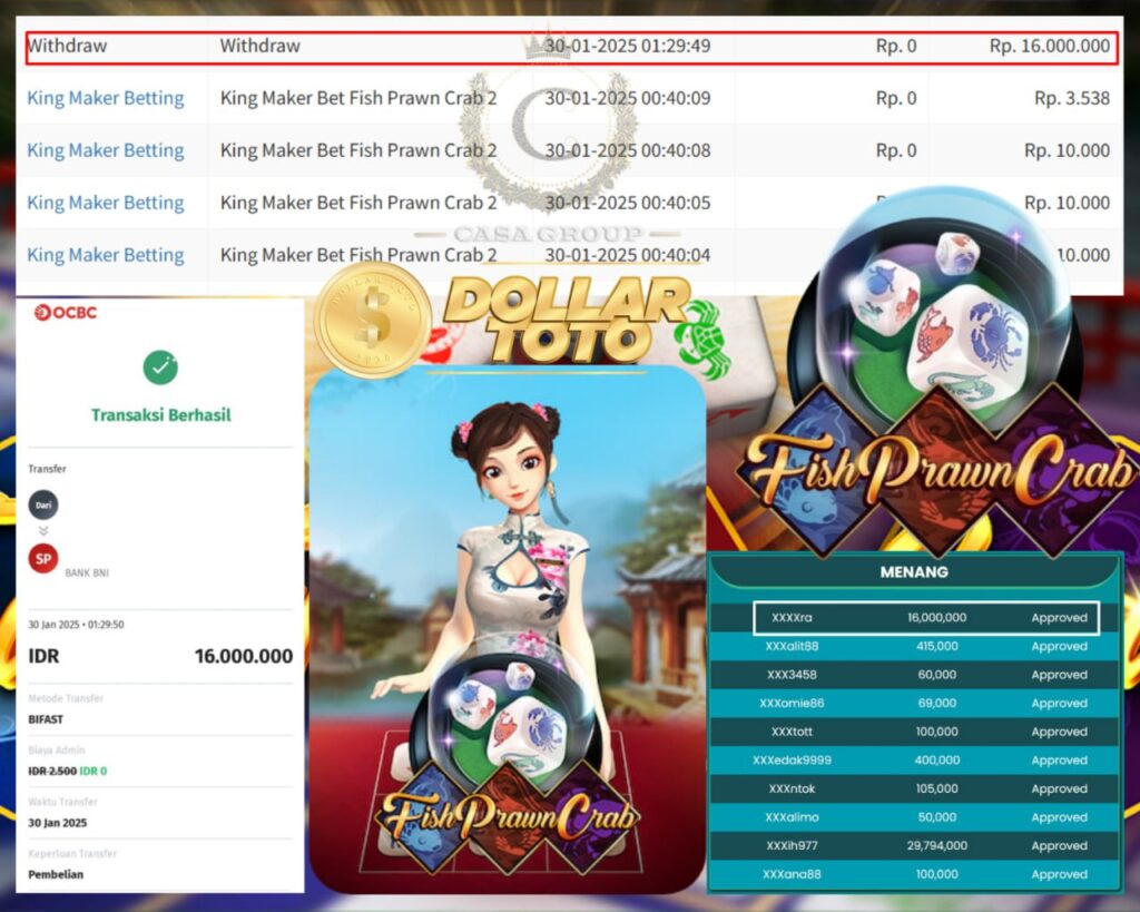 SELAMAT KEPADA MEMBER DOLLARTOTO, USER ID : XXXXra TELAH JACKPOT DI GAME KING MAKER > FISH PRAWN CRAB 2