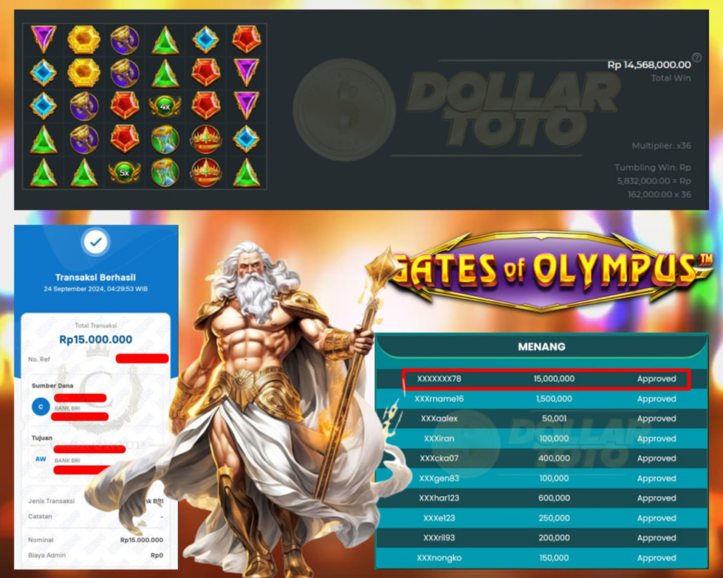 Selamat untuk User ID XXXXX78 yang sudah JP di situs DOLLARTOTO di permainan Gates of Olympus.