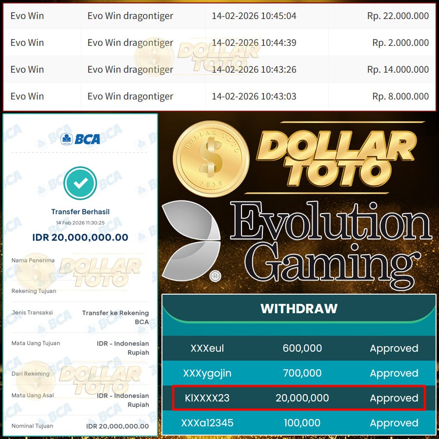 Selamat kepada bosku yang bermain di DOLLARTOTOdengan user id KlXXXX23yang telah mendapatkan kemenangan besar di game DRAGON TIGER > EVOLUTION CASINO