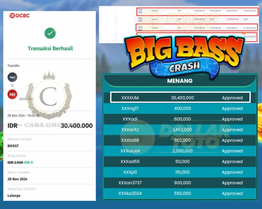 Selamat atas kemenangan boss ku dengan user id XXXXUM yang telah mendapatkan kemenangan besar di BIG BASS CRASH >> PRAGMATIC dengan kemenangan yang luar biasa.