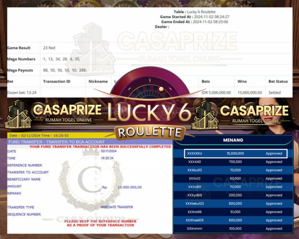 Selamat kepada bosku yang mendaftar di situs CASAPRIZE user id XXXXXKU yang telah mendapatkan kemenangan besar di LUCKY 6 ROULETTE .