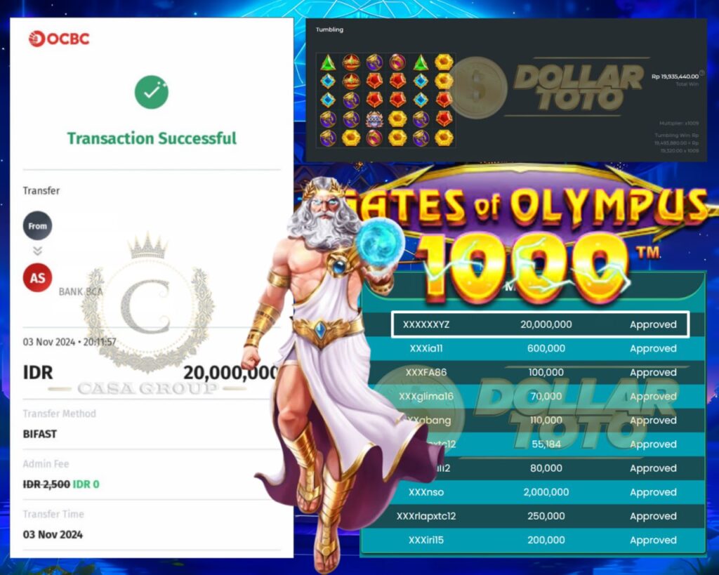 Selamat kepada bosku user id XXXXXXYZ yang telah mendapatkan kemenangan besar di game GATES OF OLYMPUS 1000.