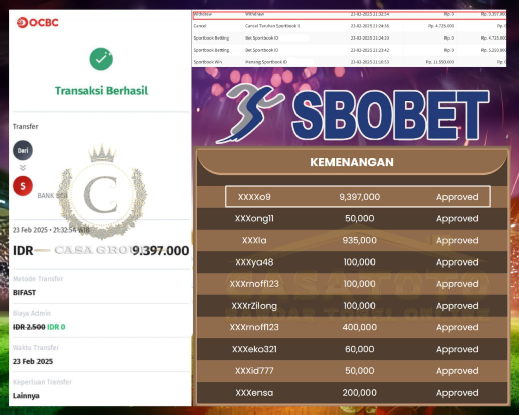 Selamat Kepada Bosku User ID XXXXXO9 Yang Telah mendapatkan Kembali Kemenangannya Di CASATOTO di Permainan SBOBET.