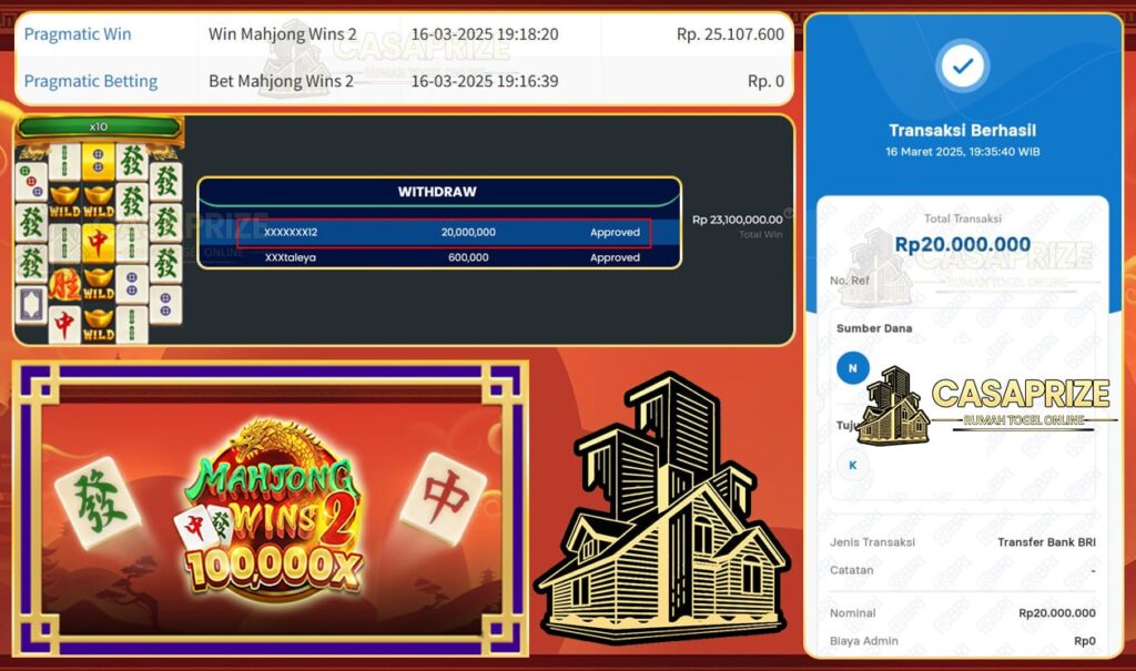 Selamat kepada bosku yang bermain di CASAPRIZE dengan user id XXXXXX12 yang telah mendapatkan kemenangan besar di game MAHYONG WINS 2