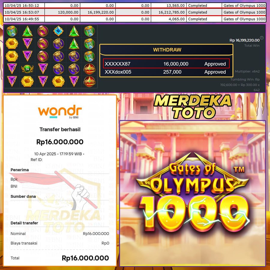 Selamat kepada member MERDEKATOTO, user id XXXXXX87 Yang Telah Mendapatkan Kemenangan Besar di Permainan PRAGMATIC PLAY >> GATES OF OLMYPUS 1000