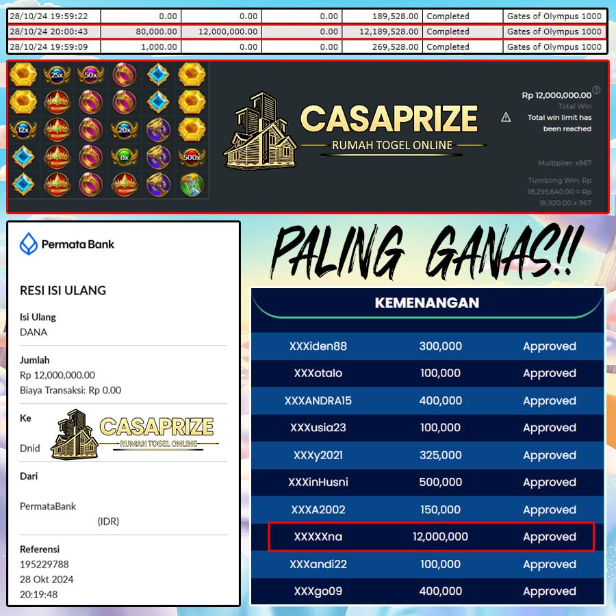 Selamat kepada bosku yang terdaftar di situs CASAPRIZE atas user id XXXXXna yang telah mendapatkan kemenangan besar di GATES OF OLYMPUS 1000.