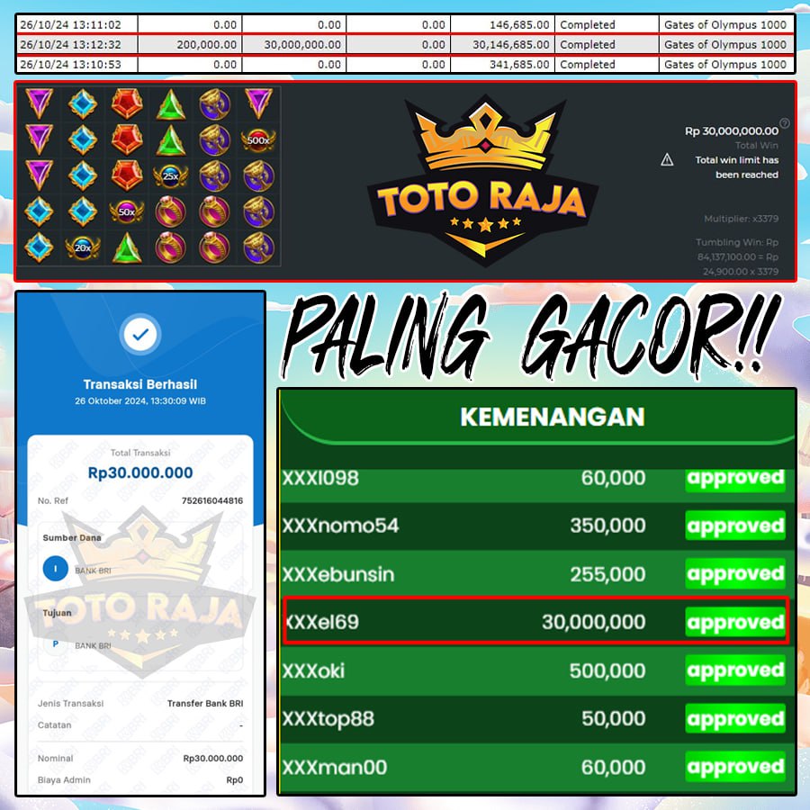 Selamat kepada member kami di TOTORAJA user XXXXl69 yang sudah mendapatkan kemenangan besar di GATES OF OLYMPUS 1000.