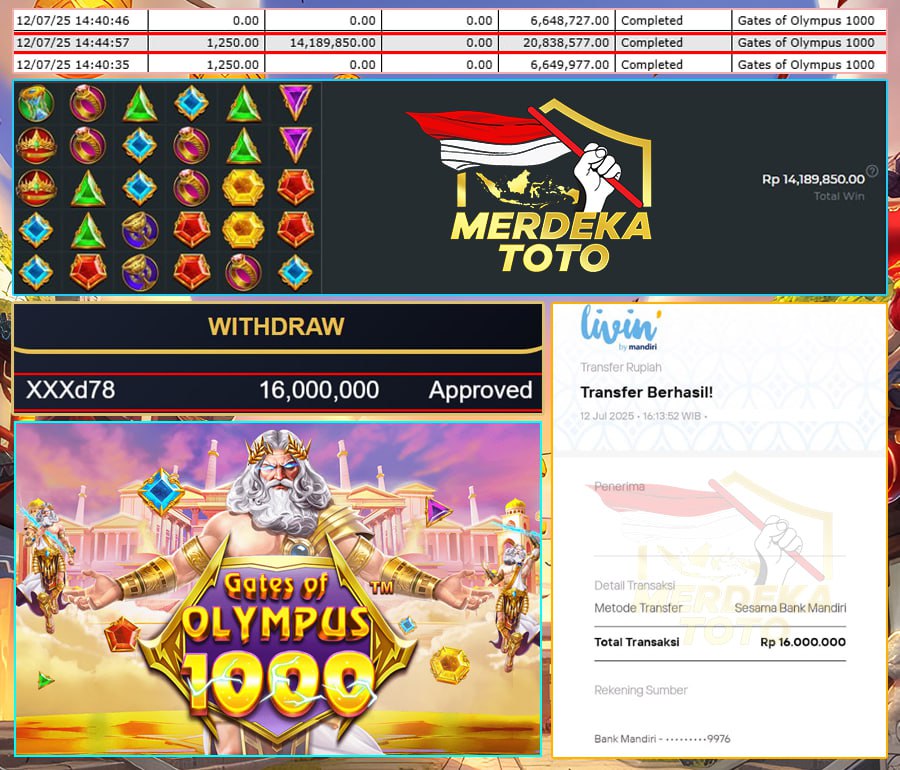 Selamat kepada member MERDEKATOTO dengan user ID XXXd78 yang telah meraih kemenangan besar di permainan Gates of Olympus 1000 dari Pragmatic Play Total kemenangan yang didapatkan : Rp 16.000.000 Pembayaran telah dilakukan secara luans dan tuntas .Bagi Anda yang belum merasakan kemenangan besar, segera daftarkan akun Anda sekarang melalui link di bawah ini dan raih kesempatan menang berikutnya.