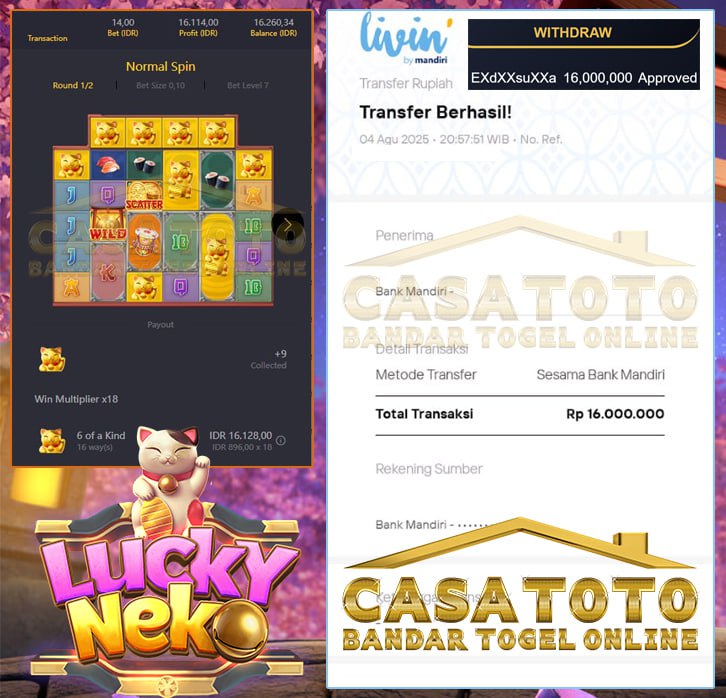 SELAMAT KEPADA MEMBER CASATOTO, USER ID : EXdXXsuXXa, MENANG DI GAME PG SOFT > LUCKY NEKO