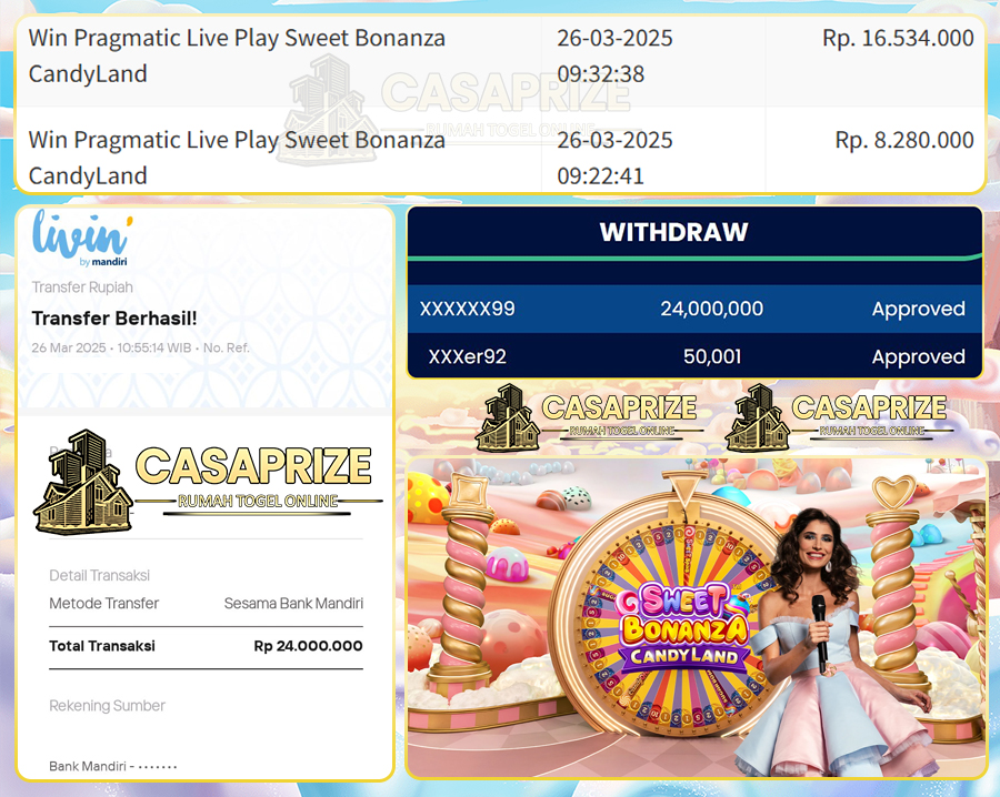 Selamat Kepada Member CASAPRIZE dengan Username XXXXXX12 Yang Beruntung Mendapatkan Kemenangan Besar di PRAGMATIC PLAY LIVE CASINO>> SWEET BONANZA CANDYLAND.