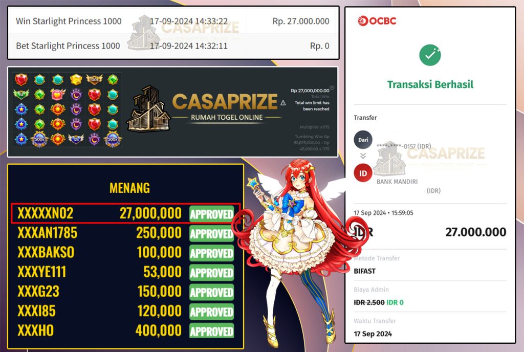 Selamat kepada member CASAPRIZE dengan user id : XXXXXXN02. Menang di game STAR LIGHT PRINCESS 1000 dari provider PRAGMATIC PLAY, kemenangan senilai Rp.27.000.000!!