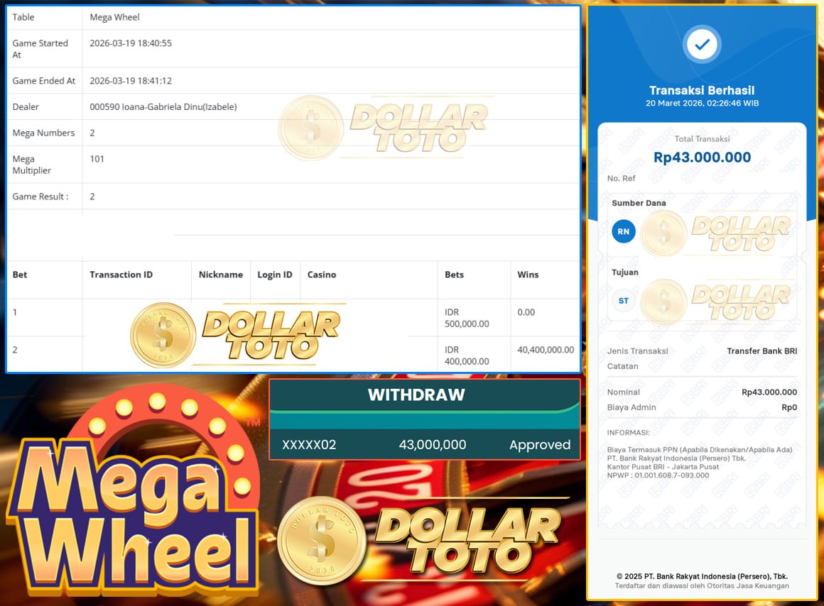 Selamat Kepada Member DOLLARTOTO dengan User ID XXXXX02 yang Kembali Meraih Kemenangan Dari Game MEGA WHEEL – PRAGMATIC LIVE.