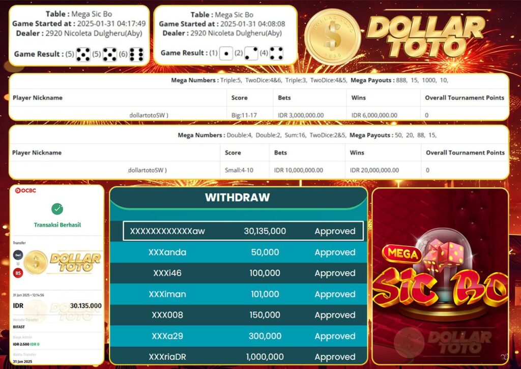 SELAMAT KEPADA MEMBER DOLLARTOTO, USER ID : XXXXXXXXXXXXXAw, MENANG DI GAME PRAGMATIC LIVE CASINO > MEGA SICBO