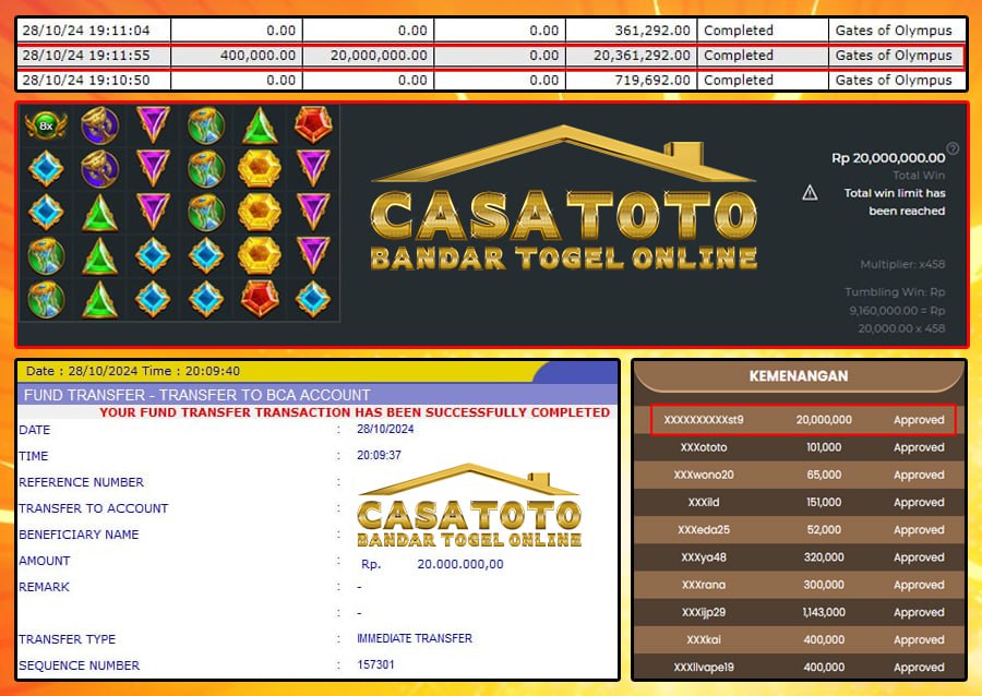 Selamat kepada bosku yang mendaftar di situs CASATOTO user id XXXXXXXXXXt9 yang telah mendapatkan kemenangan besar di GATES OF OLYMPUS.