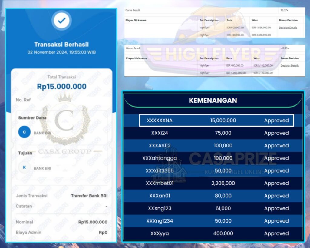 SELAMAT KEPADA MEMBER CASAPRIZE , USER ID : XXXXXXNA , MENANG DI GAME : PRAGMATIC HIGH FLAYER.